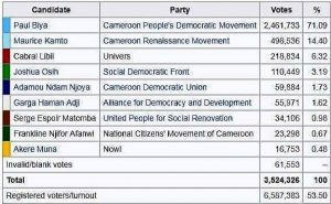 Résultat des courses: dans une population de 25 millions d’habitants environ, M. Paul Biya, bardé de tous les moyens impressionnants de l’État à sa disposition gratuitement — ce qui n’est pas le cas dans les autres démocraties comme aux USA où le président-candidat rembourse dans son budget de campagne chaque déplacement électoral à bord du US Air Force One entre autres —, M. Paul Biya, disais-je, se dit lui-même élu par environ 10% de la population. Il est par conséquent le représentant de qq marginaux..
